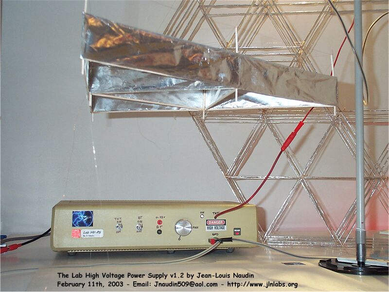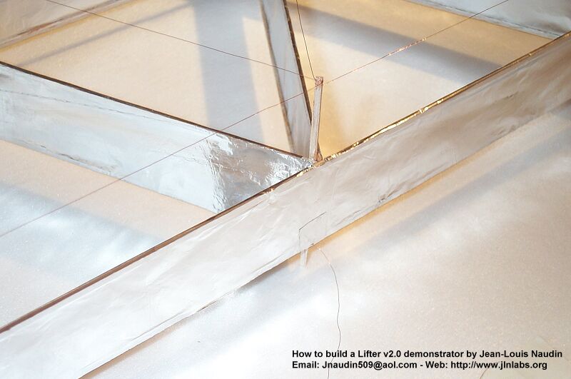 Le Lifter v2.0 est terminé, l'alimentation THT +30kV se fait par un des côtés supérieurs ( à gauche du Lifter sur la photo ci-dessous ) via un fil fin de cuivre (1/10 mm). Une des armatures d'aluminium, celle qui est opposée à la connection positive, est reliée à la terre ( à droite du Lifter sur la photo ci-dessous ). Le fil de terre est fixé sur la feuille d'aluminium grâce à du ruban adhésif aluminium. L'alimentation THT devra être capable de débiter environ 500 µA à au moins +30kV. Je vous recommande de protéger votre alimentation en mettant une résistance de 470 kOhm ( 2W ) en série avec la sortie THT afin de limiter le courant.