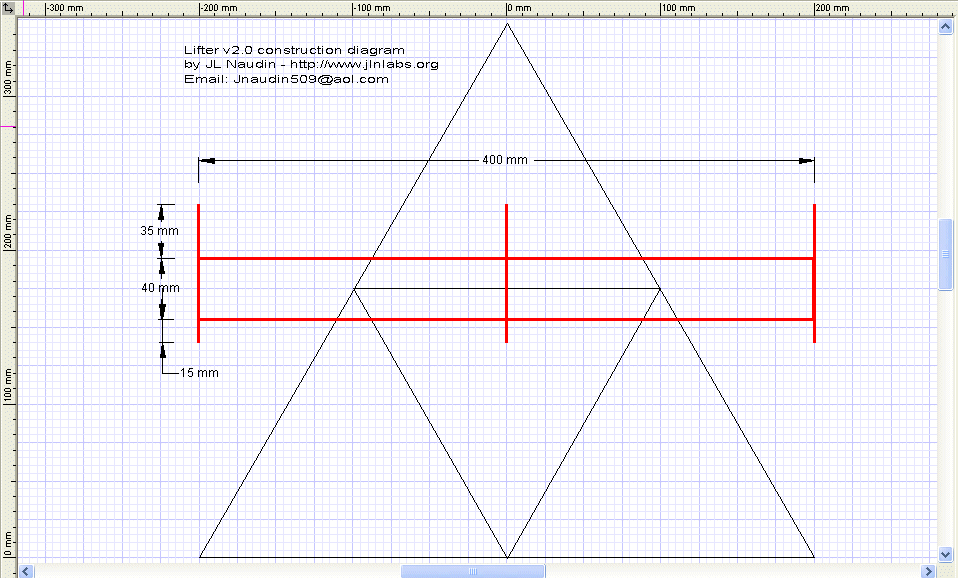 2-A) Dessinez sur votre planche de travail, un rectangle de 400x40 mm dans le plan horizontal avec trois traits perpendiculaires de 90mm représentant les baguettes verticales de votre Lifter ( voir dessin ci-dessous ). Cela représente la vue en coupe de votre Lifter. Mettre là aussi du ruban adhésif sur toutes les intersections pour éviter que les baguettes de balsa ne collent sur le plan de travail.