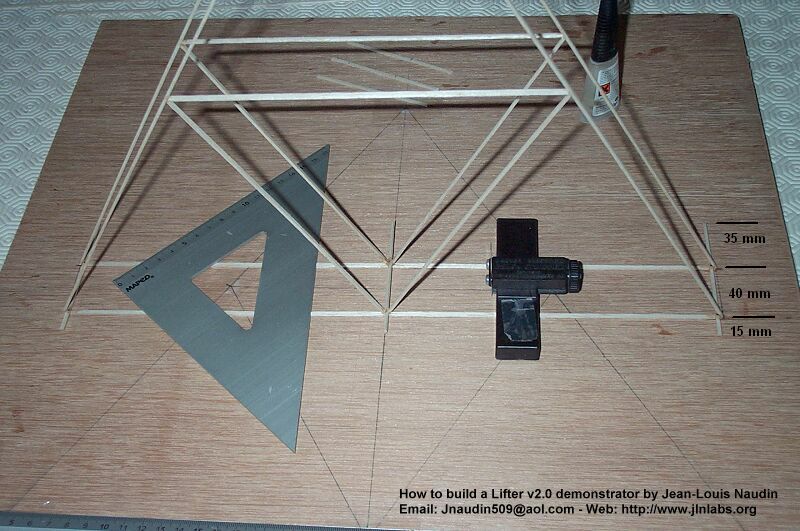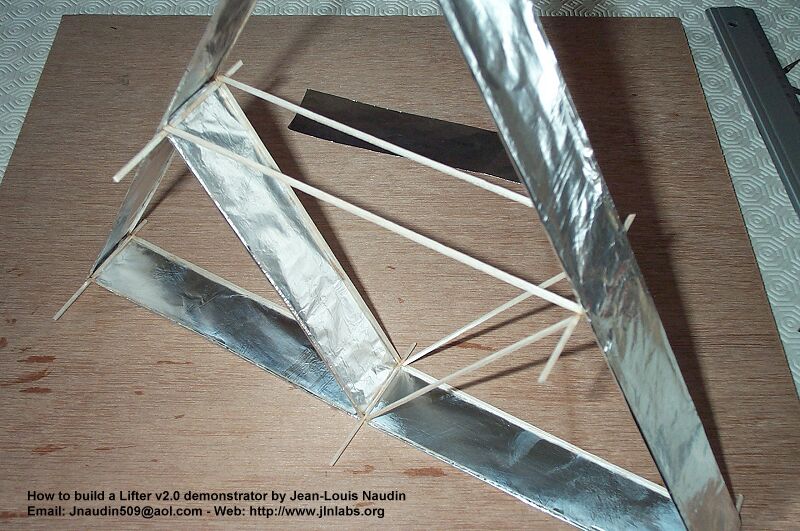2-B) Placez et maintenez verticalement avec précaution les deux structures triangulaires ( Attention elles sont fragiles ) comme indiqué sur la photo ci dessous, puis coller avec une goutte de cyano toutes les baguettes transversales à chaque intersections.